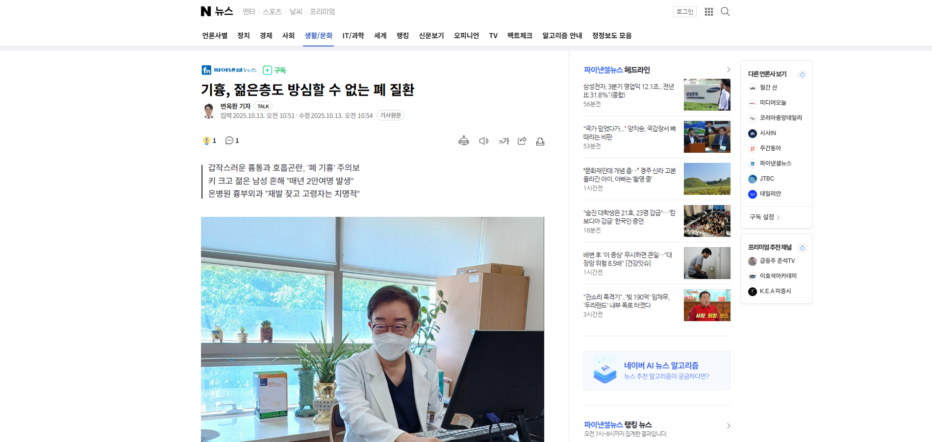 최 교수는 “폐기흉은 젊은 건강인에게도 갑작스럽게 발생해 놀라울 수 있지만 고령자나 폐질환자에게는 훨씬 더 치명적일 수 있다”며 “갑작스러운 흉통과 호흡곤란을 대수롭지 않게 넘기지 말고, 즉시 응급실이나 당직 병원을 찾는 것이 안전하다”고 조언했다.