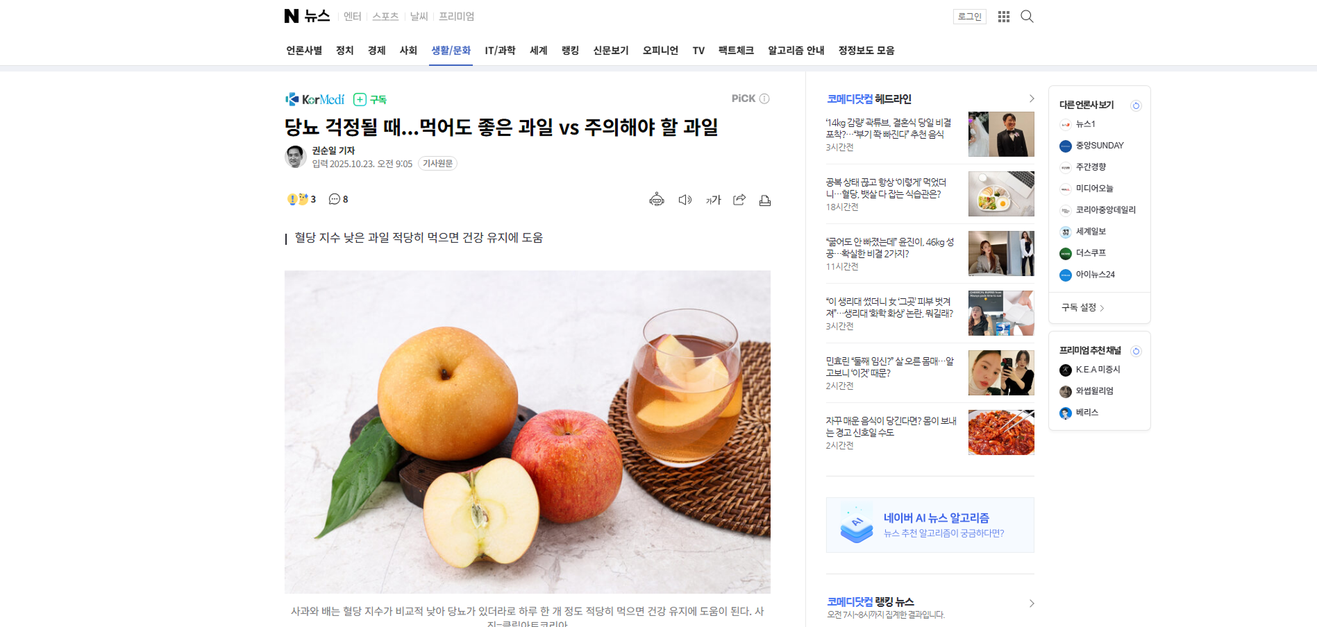 미국 클리브랜드 클리닉 자료에 따르면 과일에 들어 있는 천연 당분은 섬유질이 많아 혈당을 급격히 올리지 않고, 천천히 소화되기 때문에 안전하게 섭취할 수 있다. 오히려 신선한 과일이 신체에 필요한 영양소와 섬유질을 보충해 당뇨 환자에게도 이점을 제공할 수 있다는 것이다.