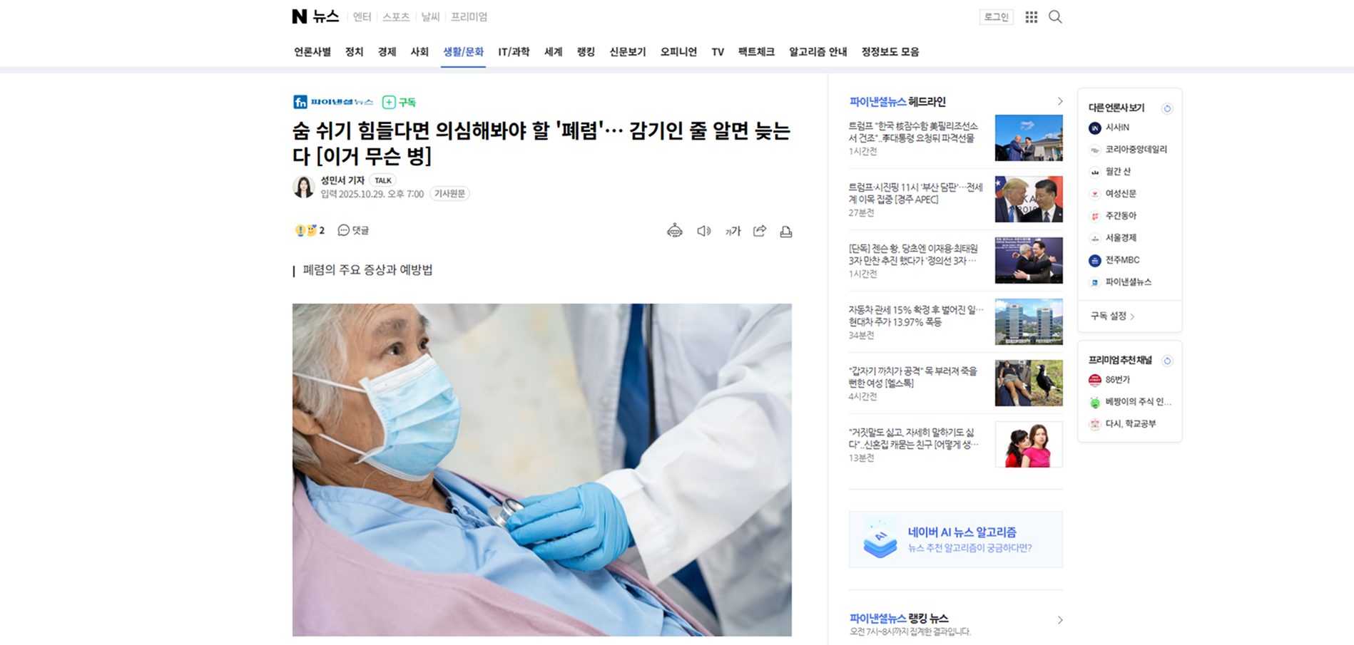 환절기만 되면 감기인 줄 알았던 증상이 좀처럼 나아지지 않는다면 폐렴을 의심해봐야 한다. 요즘처럼 일교차가 큰 환절기엔 감기 환자가 늘어나는데, 이들 중 폐렴을 혼동하기 쉽지만, 폐렴은 염증이 폐 깊숙이 번지며 호흡 기능을 떨어뜨려 사망에 이를 수 있는 고위험 질환이다. 국가데이터처(舊 통계청)의 2024년 국내 사망원인통계에 따르면, 폐렴은 암과 심장질환에 이어 사망 원인 3위였다.