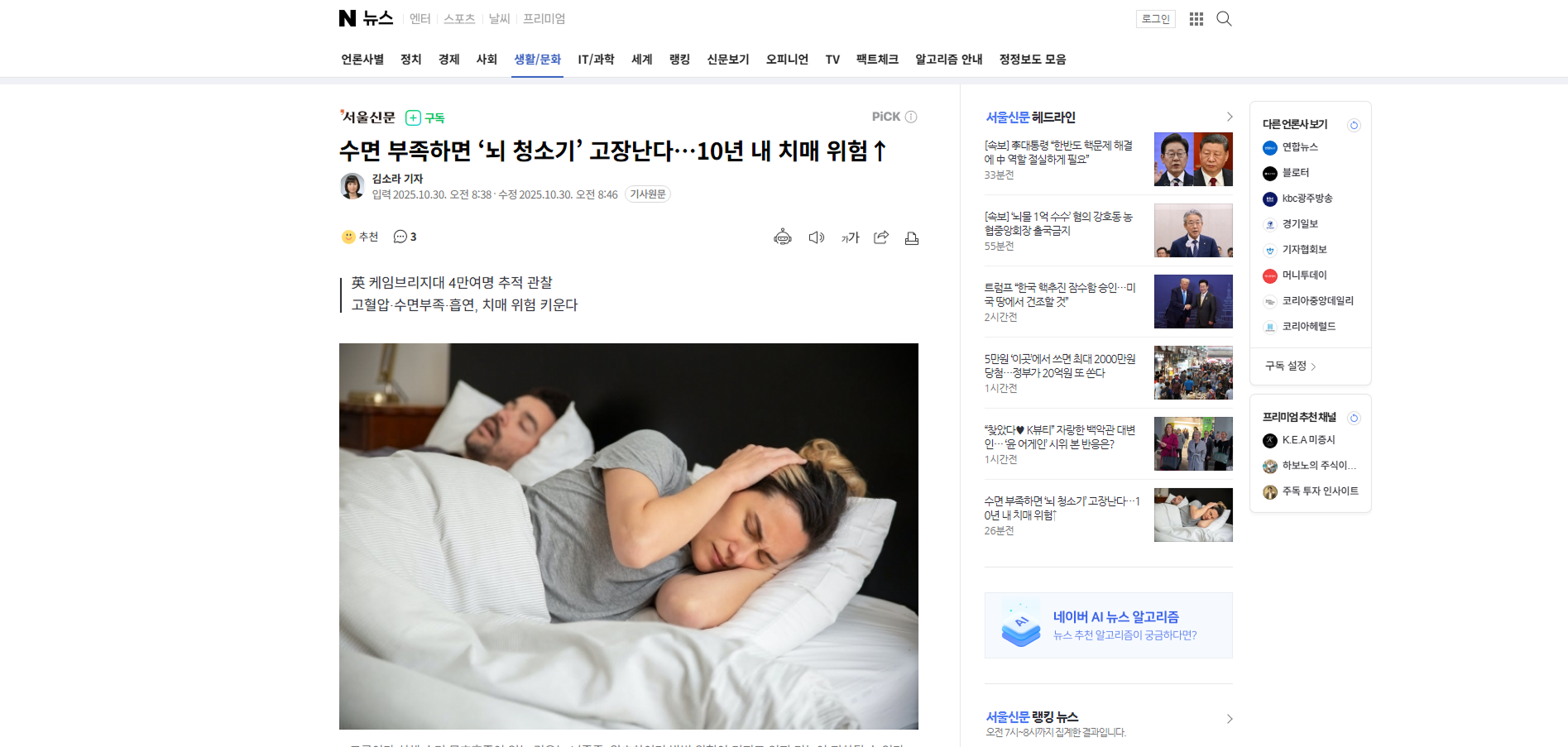 수면 부족하면 ‘뇌 청소기’ 고장난다…10년 내 치매 위험↑