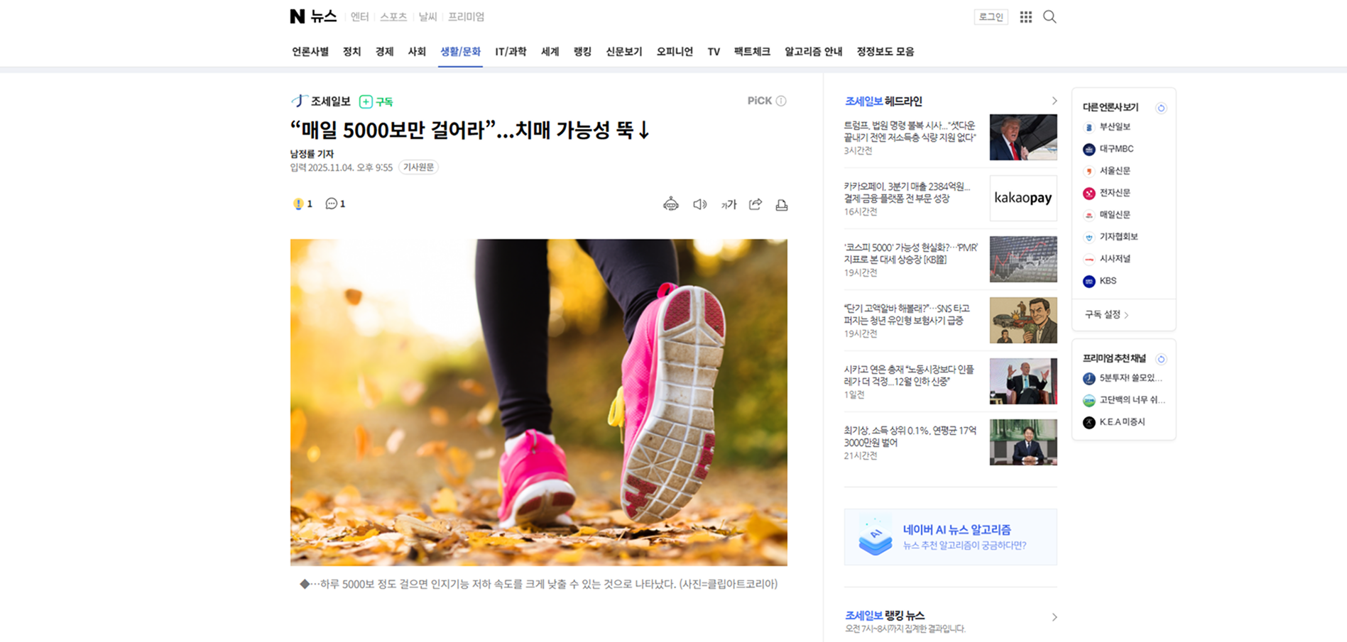 미국 하버드대 의대와 협력 병원 네트워크인 매스 제너럴 브리검 연구팀은 4일 '네이처 메디신'(Nature Medicine)을 통해 하루 5000~7000보 걸을 때 인지기능 저하가 평균 7년 늦춰졌다고 발표했다.