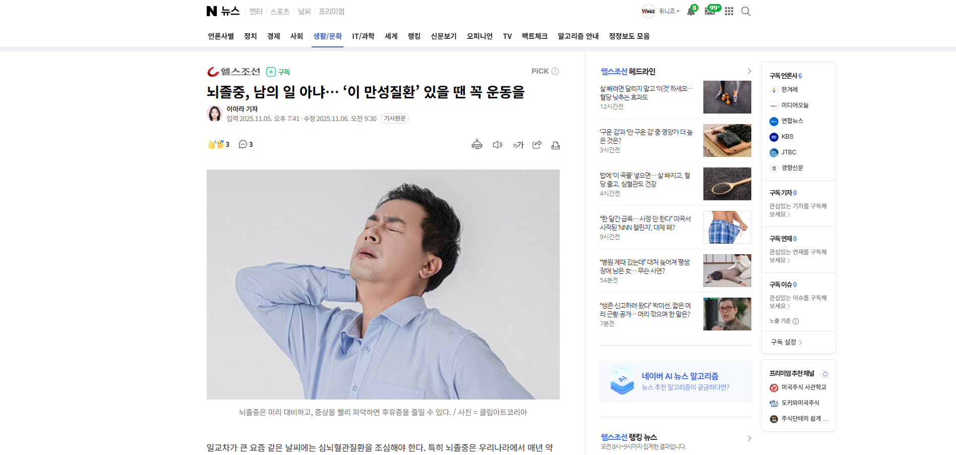 뇌졸중은 한순간에 삶의 일상을 바꿀 수 있는 질환이다. 그러나 그것을 막는 것은 생각보다 아주 ‘일상적인 습관’이다. 특히 위험 인자(고혈압·고지혈증·흡연·비만 등)를 가진 사람이라면 혈압 조절, 금연, 적정 체중 유지, 규칙적인 신체 활동, 심방세동(부정맥) 관리 등을 실천해야 한다.