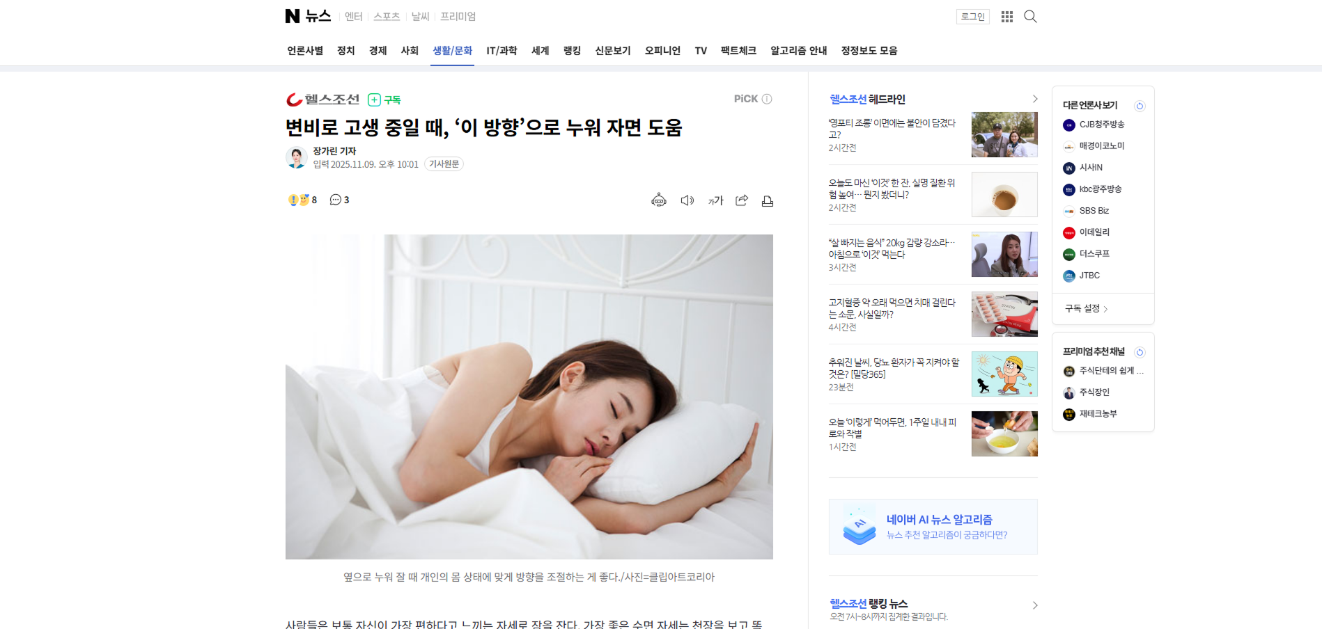 변비가 있을 때는 왼쪽으로 누워 자는 것이 도움이 된다. 수면 전문가 리사 아티스 박사는 “왼쪽으로 누워 자면 중력이 소장에서 대장으로 음식물과 배설물이 원활히 이동하도록 도와 배변 활동을 촉진한다”고 했다. 반대로 설사일 때는 오른쪽으로 누워 자는 것이 유리하다. 오른쪽으로 누우면 몸의 오른쪽이 아래로 향하면서 소장에서 넘어온 변이 대장의 오른쪽, 즉 상행결장에 더 오래 머물게 된다. 이렇게 되면 변이 대장을 따라 이동하는 속도가 늦춰져 수분 흡수 시간이 늘어나고, 결과적으로 변의 빈도를 줄이는 데 도움이 된다.