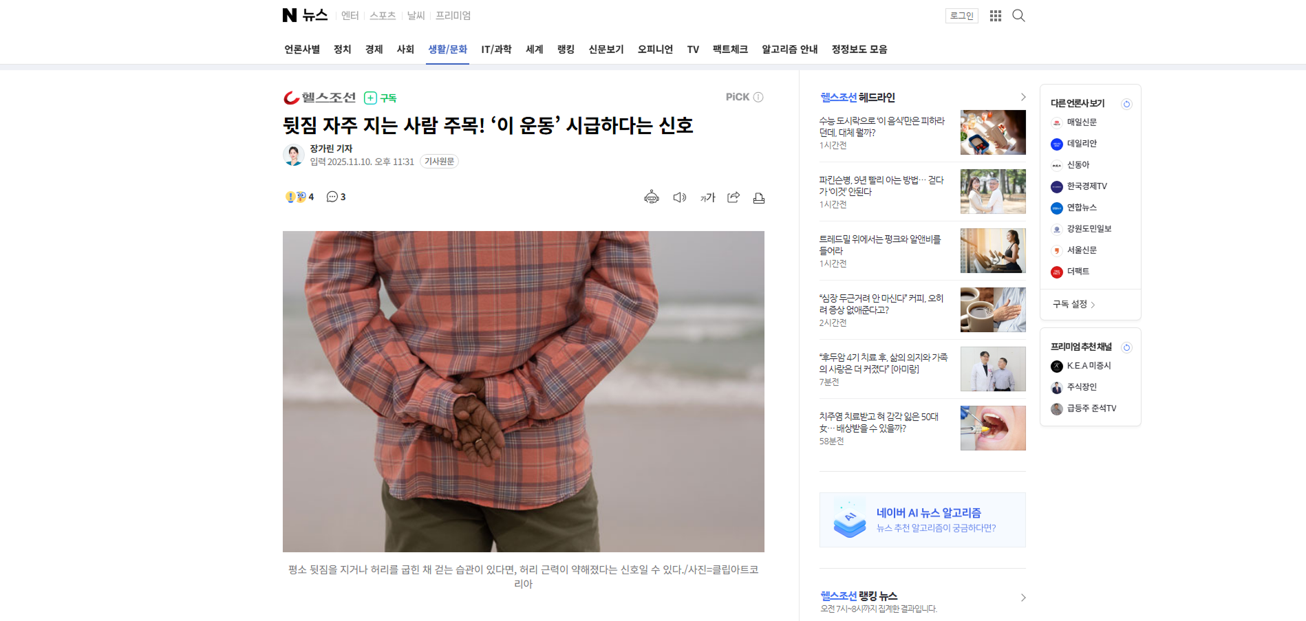 허리 근력을 지키려면 운동뿐 아니라 식습관 관리도 중요하다. 소화가 안 된다는 이유로 고기를 지나치게 피하는 경우가 있지만, 생선이나 달걀 등 다른 식품으로라도 단백질을 충분히 섭취해야 근육 손실을 막을 수 있다. 또 근육의 대사와 회복을 돕는 비타민D도 꾸준히 보충하는 것이 좋다. 걷기나 가벼운 활동처럼 일상적인 움직임을 유지하는 것도 근력 유지에 큰 도움이 된다.