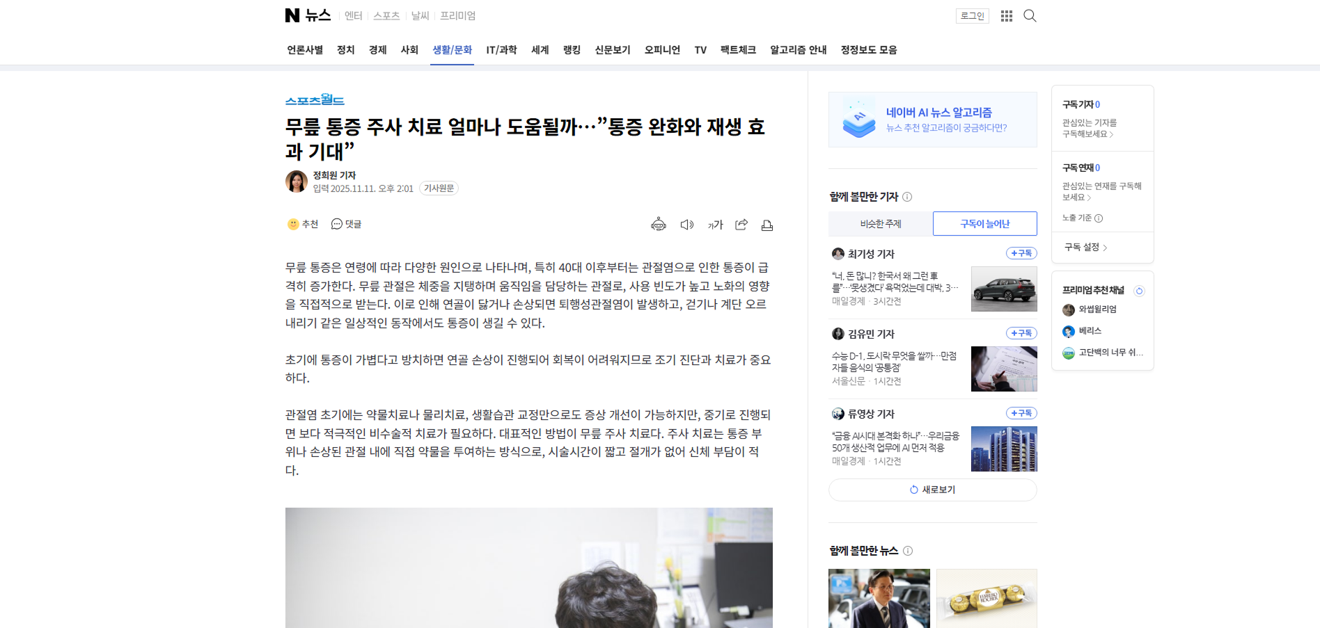 무릎 통증 주사 치료 얼마나 도움될까…”통증 완화와 재생 효과 기대”
