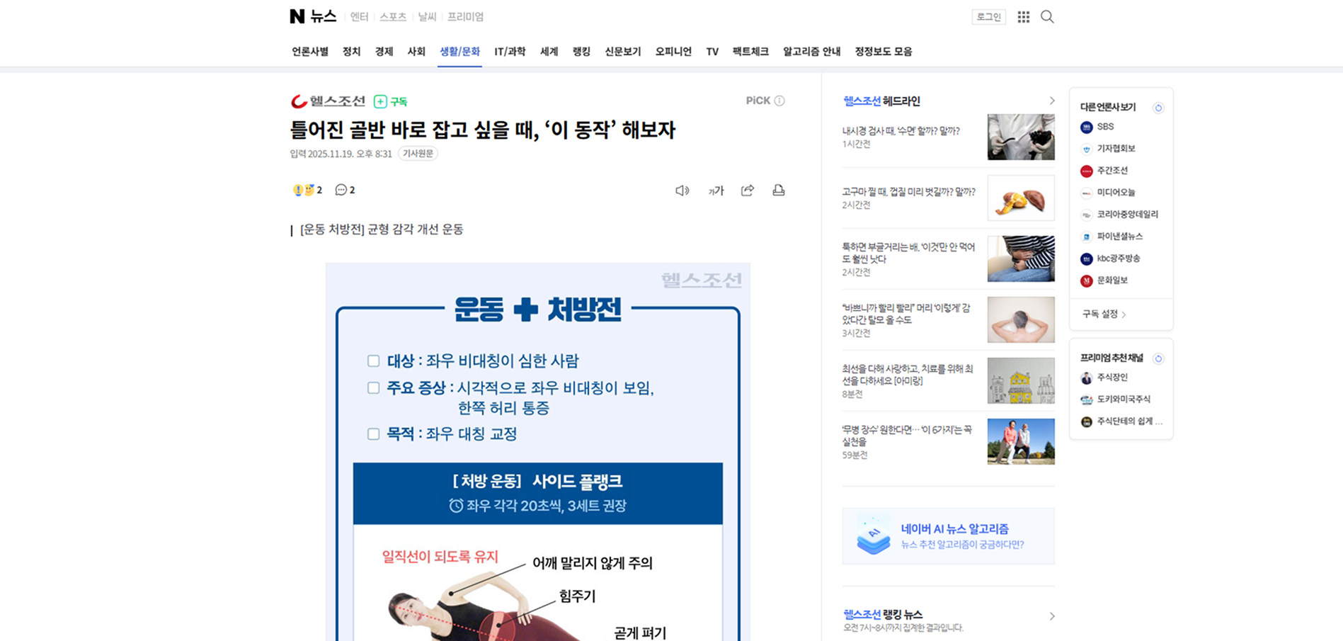 균형 감각은 몸의 중심을 얼마나 안정적으로 지탱하느냐가 좌우해, 결국 '코어'가 가장 중요하다. 몸을 옆으로 일직선이 되도록 유지하는 사이드 플랭크는 대표적인 코어 운동이다. 중심 코어뿐만 아니라 몸의 측면 근육인 복사근(옆구리)·요방형근(허리 측면)·중둔근(엉덩이 옆)에도 힘을 줘 한쪽으로 기울어지려는 힘을 스스로 제어하게 해, 좌우 불균형을 맞추는 데 효과적이다. 꾸준히 따라 하면 자세가 곧아지고, 중심이 흔들리는 것을 개선할 수 있다.