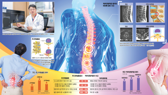 척추관협착증은 퇴행성 변화로 척추관이 좁아지면서 척수나 신경이 압박을 받는 질환이다. 허리 신경이 눌리면서 다리로 방사되는 통증을 유발한다는 공통점 때문에 요추추간판탈출증(허리디스크)과 혼동하기 쉬운데 자세히 알고 보면 그 양상이 다르다. 요추추간판탈출증은 급성으로, 척추관협착증은 서서히 진행되는 경우가 많다. 요추추간판탈출증이 허리를 숙이거나 앉을 때 통증이 심해지는 경향을 보이는 데 반해 척추관협착증은 허리를 숙이거나 누우면 통증이 덜해진다. 이런 상태가 지속되면 허리를 굽힌 자세가 습관화돼 이른바 ‘꼬부랑 허리’로 굳어지기도 한다. 결정적 차이는 많이 발병하는 연령대에 있다. 추간판탈출증이 나이를 가리지 않는 반면 척추관협착층은 주로 50대 이후 중장년층에게서 나타난다. 급속한 고령화로 척추관협착증 환자는 급증하는 추세다. 건강보험심사평가원에 따르면 지난해 척추관협착증으로 진료받은 인원은 185만6224명에 달했다.