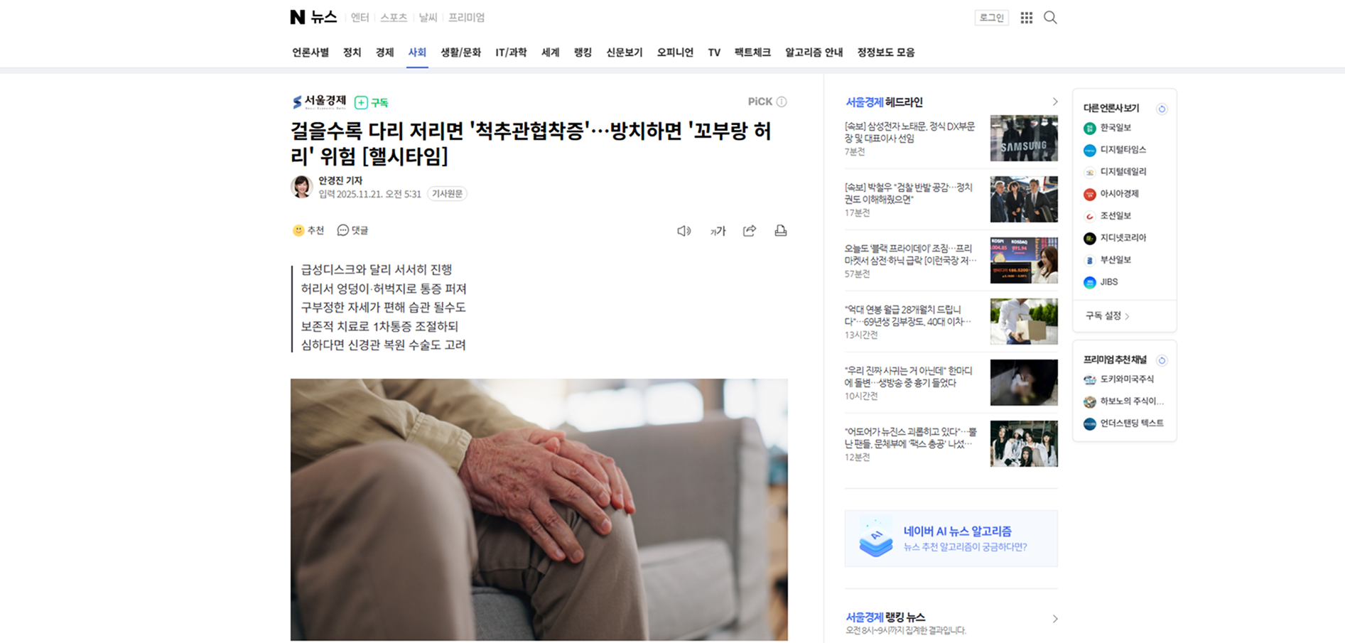 30년 넘게 다녔던 회사를 나와 아파트 경비원으로 일하기 시작한 60대 남성 박 부장(가명)은 얼마 전부터 출근이 괴로워졌다. 걷기만 하면 다리에 당기는 듯한 통증이 나타난 탓이다. 처음에는 오랜만에 많이 걸어서 근육통이 생긴 것으로 여겼다. 그러나 한 달이 지나도록 나아질 기미가 보이질 않았다. 아침 기온이 영하로 떨어지자 통증이 허리까지 번져 좁은 경비실에 앉아 근무하기가 여간 고역이 아니었다. 걱정스러운 마음에 인터넷 검색을 해보니 허리디스크나 척추관협착증일 수 있다는 정보를 접했지만 증상만으로는 도저히 구분할 수 없었다. 심란해하던 박씨는 지인의 권유로 신경외과를 찾았고, 자기공명영상(MRI) 검사 결과 ‘척추관협착증’ 진단을 받았다.