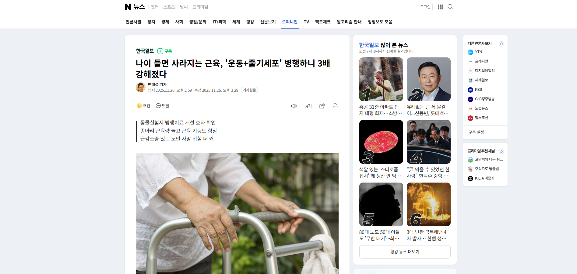 초고령 사회로 진입한 한국 사회에서 노년기 건강을 위협하는 가장 큰 복병으로 ‘근감소증’이 꼽힌다. 근감소증은 근육량과 근력이 급격히 줄어 신체 기능이 떨어지는 질환이다. 마땅한 약물 치료제가 없는 상황에서, 국내 연구진이 운동과 줄기세포 치료를 병행할 경우 치료 효과가 극대화한다는 사실을 밝혀 주목받고 있다.