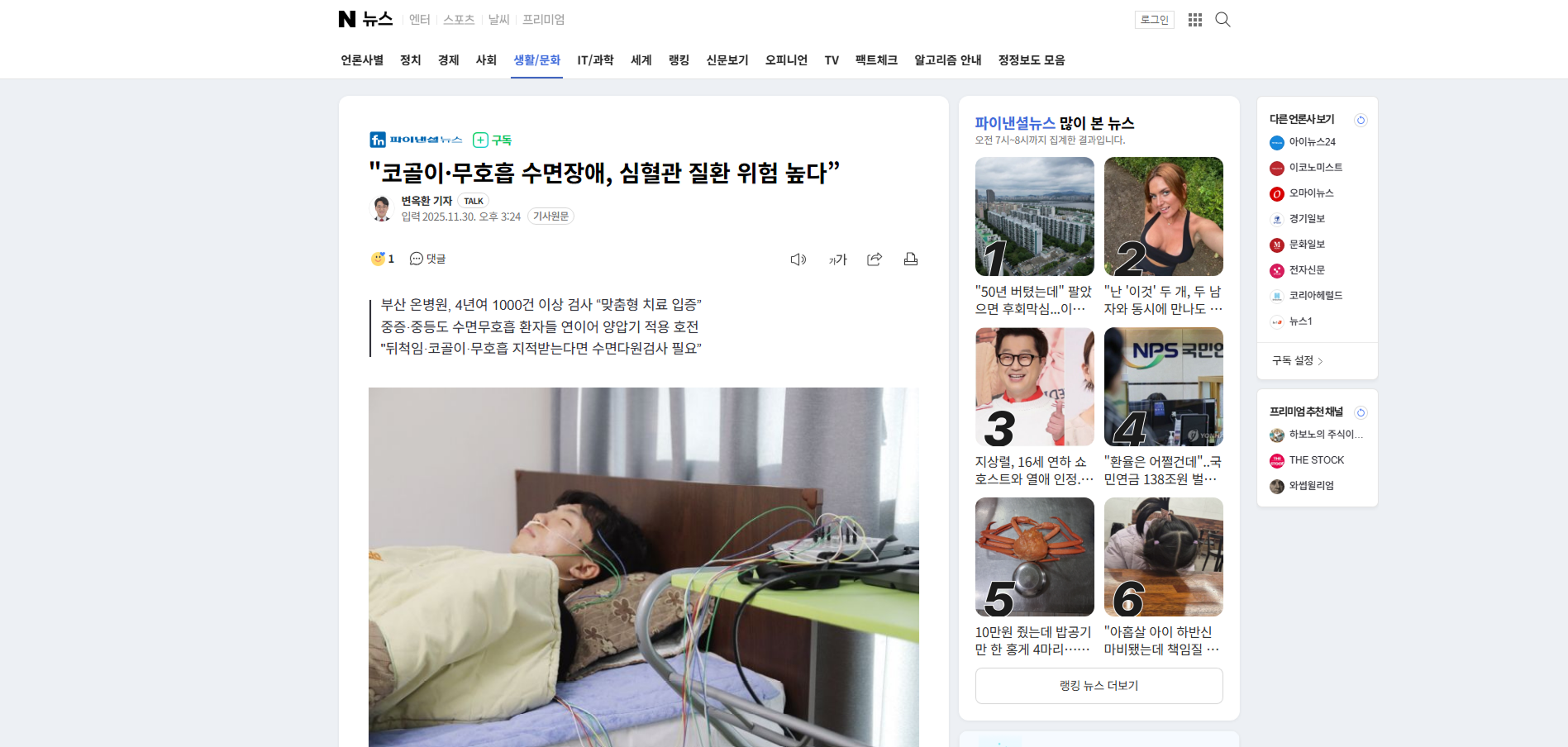 이어 “밤새 뒤척이거나 코골이·무호흡을 자주 지적받는다면, 단순 피로로 넘기지 말고 전문의 상담과 검사를 통해 정확한 상태를 확인하는 것이 필요하다”며 “조기 진단과 맞춤치료는 심혈관질환과 인지기능 저하 등 장기적 위험을 줄이는 데 결정적인 역할을 한다”고 덧붙였다.