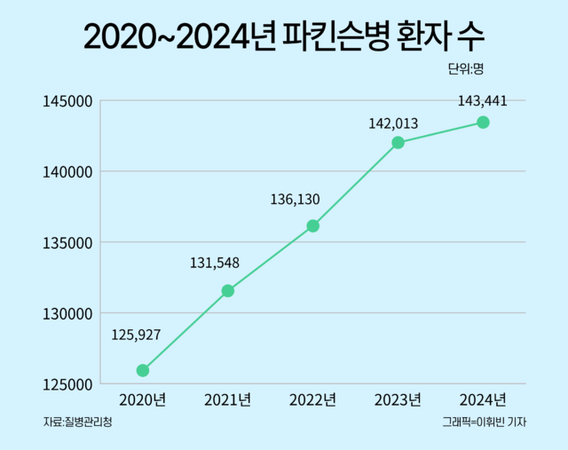 국내 파킨슨병 환자가 가파른 증가세를 보이고 있다. 건강보험심사평가원 자료에 따르면 2024년 환자 수는 14만3441명으로 2010년 6만1565명에서 14년 만에 134% 증가했다. 2020년 12만5927명과 비교하면 4년 만에 13.9% 늘어난 수치다.