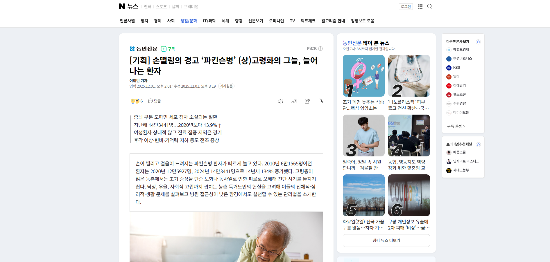 후각 이상·변비·기억력 저하 등도 전조 증상손이 떨리고 걸음이 느려지는 파킨슨병 환자가 빠르게 늘고 있다. 2010년 6만1565명이던 환자는 2020년 12만5927명, 2024년 14만3441명으로 14년새 134% 증가했다. 고령층이 많은 농촌에서는 초기 증상을 단순 노화나 농사일로 인한 피로로 오해해 진단 시기를 놓치기 쉽다. 낙상, 우울, 사회적 고립까지 겹치는 농촌 독거노인의 현실을 고려해 이들의 신체적·심리적·생활 문제를 살펴보고 병원 접근성이 낮은 환경에서도 실천할 수 있는 관리법을 소개한다.