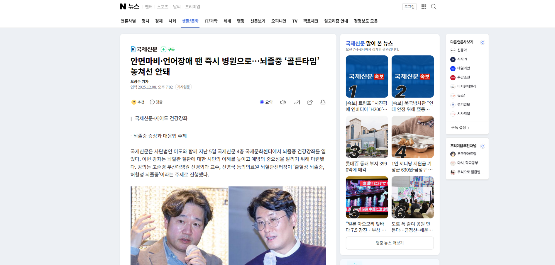 국제신문은 사단법인 이도와 함께 지난 5일 국제신문 4층 국제문화센터에서 뇌졸중 건강강좌를 열었다. 이번 강좌는 뇌혈관 질환에 대한 시민의 이해를 높이고 예방의 중요성을 알리기 위해 마련됐다. 강의는 고준경 부산대병원 신경외과 교수, 신병국 동의의료원 뇌혈관센터장이 ‘출혈성 뇌졸중, 허혈성 뇌졸중’이라는 주제로 진행했다.