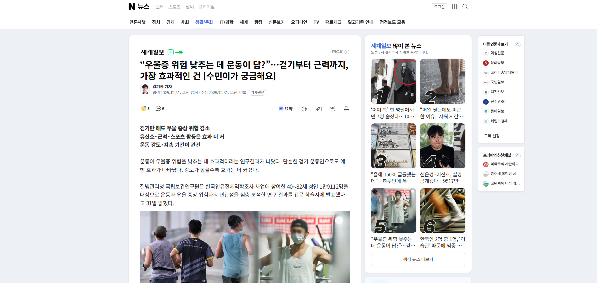 연구진은 “고강도 운동이 어려운 고령층 등은 꾸준한 걷기 운동이 우울증 예방을 위한 매우 효과적인 대안이 될 수 있다”며 “유산소, 근력운동, 스포츠활동 등을 통해 우울증 예방 효과를 극대화할 수 있다”고 설명했다.