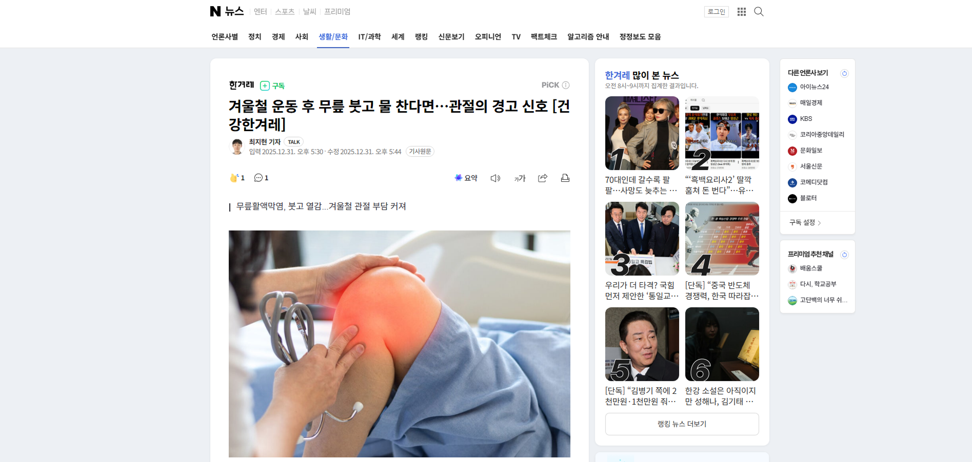 겨울철 운동 후 무릎 붓고 물 찬다면…관절의 경고 신호 [건강한겨레]