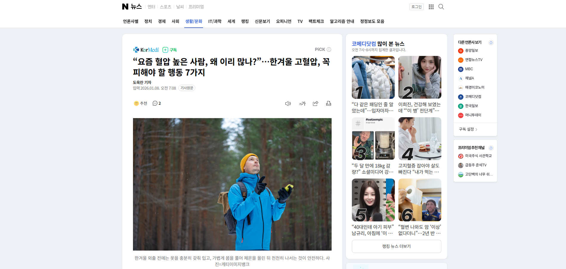겨울철 고혈압의 가장 큰 적은 추위 그 자체보다, 추위를 대하는 방식이다. 평소와 다른 행동을 무심코 반복하는 순간 혈압은 가장 먼저 반응한다. 작은 생활 습관을 점검하는 것만으로도 한겨울 혈압 관리는 훨씬 수월해질 수 있다.