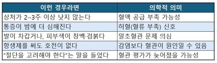 혈관을 넓히는 치료는 시작일 뿐이다. 이후 상처 관리, 감염 조절, 당뇨 관리가 함께 이뤄져야 치료 효과가 유지된다.