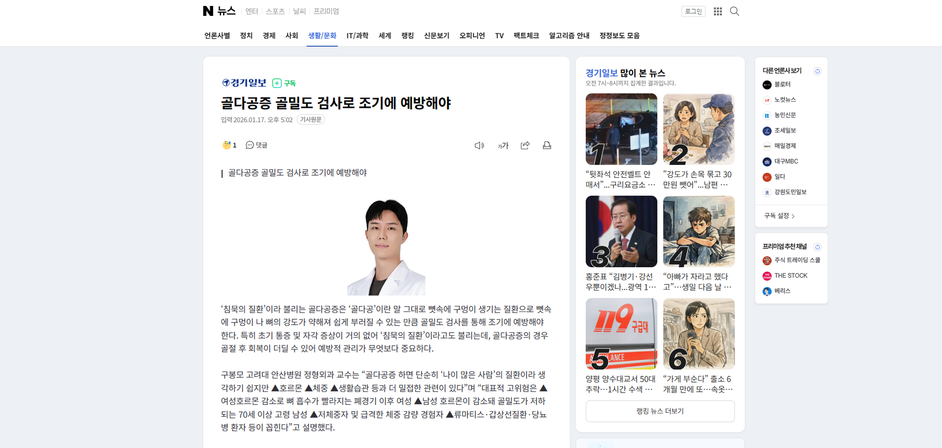 구봉모 고려대 안산병원 정형외과 교수는 “골다공증 하면 단순히 ‘나이 많은 사람’의 질환이라 생각하기 쉽지만 ▲호르몬 ▲체중 ▲생활습관 등과 더 밀접한 관련이 있다”며 “대표적 고위험은 ▲여성호르몬 감소로 뼈 흡수가 빨라지는 폐경기 이후 여성 ▲남성 호르몬이 감소돼 골밀도가 저하되는 70세 이상 고령 남성 ▲저체중자 및 급격한 체중 감량 경험자 ▲류마티스·갑상선질환·당뇨병 환자 등이 꼽힌다”고 설명했다.